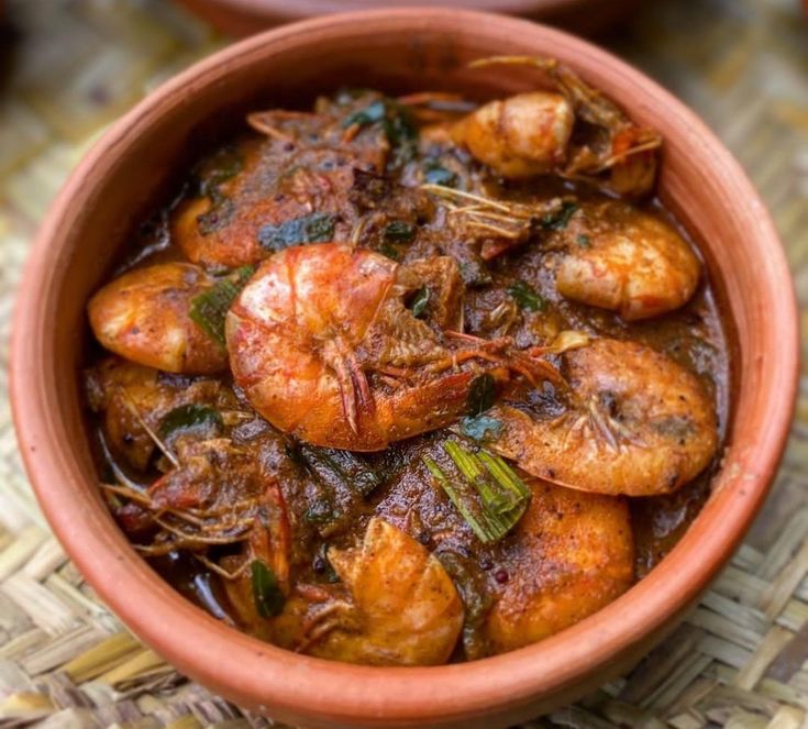 Pieces of prawn marinated in vinegar and spices and cooked.