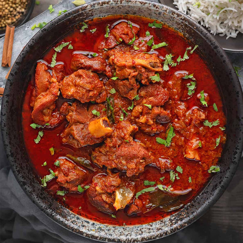 Mutton mixed with milk, tomatoes, spiced and cooked with hot chilies